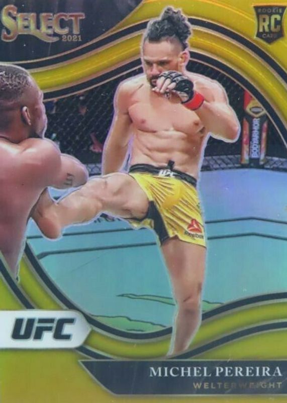 The Michel Pereira 2021 Select UFC #262 Octagonside Gold /10 Rookie card in Raw condition has not changed in price in the last 30 days and was last sold for $160.00 .
