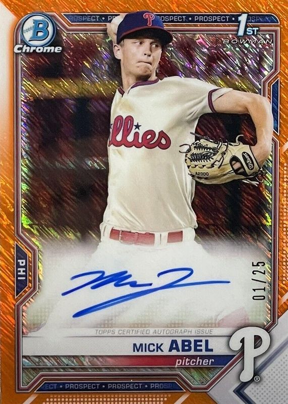 Best Prices Available For Sale of Mick Abel 2021 Bowman #CPA-MAB Chrome Prospect Auto - Orange Shimmer Refractor /25 (1st)