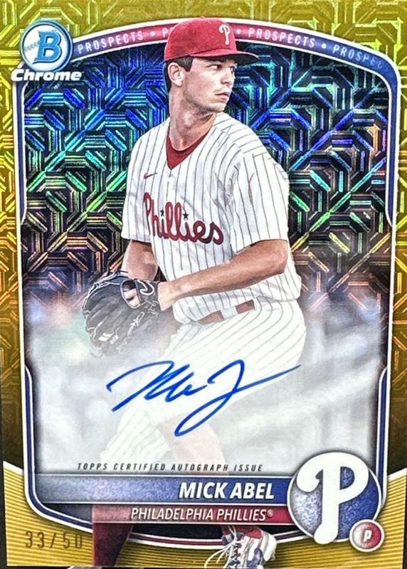 Best Prices Available For Sale of Mick Abel 2025 Bowman Mega Box #BMA-MA Chrome Prospect Auto - Gold Refractor /50
