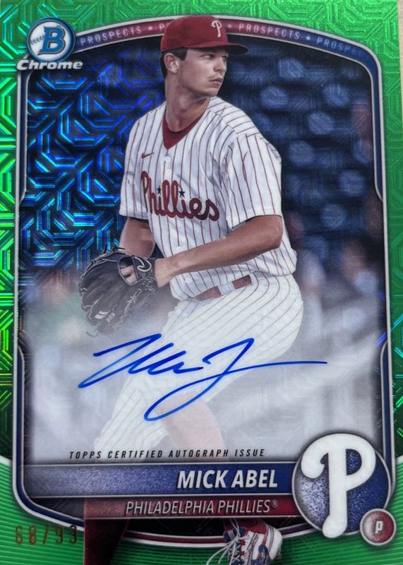 Mick Abel 2025 Bowman Chrome Mega Green Refractor Auto /99 Philadelphia Phillies