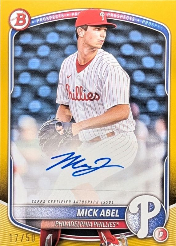 2025 Bowman Mick Abel GOLD Prospect Auto /50 #BPA-MA Phillies 9 K MLB Debut 🔥📈