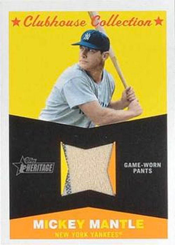 The Mickey Mantle 2009 Topps Heritage #CC-MM Clubhouse Collection Relics card is 1 of 7 Mickey Mantle's card variations in the 2009 Topps Heritage set being tracked by Sports Card Investor, including #563 50th Anniversary Buybacks, #BF9 Flashbacks, #BF1 Flashbacks, #MM Flashback Stadium Relics, and #MM2 Flashback Stadium Relics.