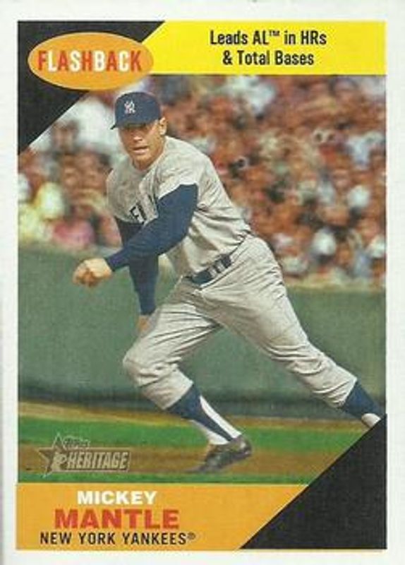 The Mickey Mantle 2009 Topps Heritage #BF9 Flashbacks card is 1 of 7 Mickey Mantle's card variations in the 2009 Topps Heritage set being tracked by Sports Card Investor, including #563 50th Anniversary Buybacks, #CC-MM Clubhouse Collection Relics, #BF1 Flashbacks, #MM Flashback Stadium Relics, and #MM2 Flashback Stadium Relics.