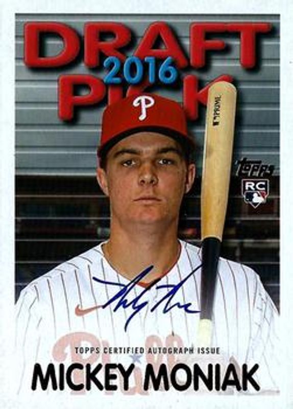 The Mickey Moniak 2021 Topps Archives #TDPA-MM 1994 Topps Draft Pick Autographs /200 Rookie card is 1 of 17 Mickey Moniak's card variations in the 2021 Topps Archives set being tracked by Sports Card Investor, including #262 Base, #262b Base, #262 Rainbow Foil /150, #262 Green /125, and #262 Silver /99.