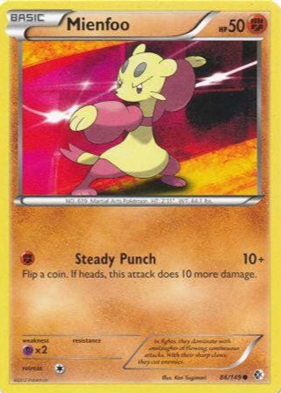 The Mienfoo 2012 Black & White: Boundaries Crossed #086/149 Base card in Raw TCG (Lightly Played) condition has not changed in price in the last 30 days and was last sold for $1.10 .