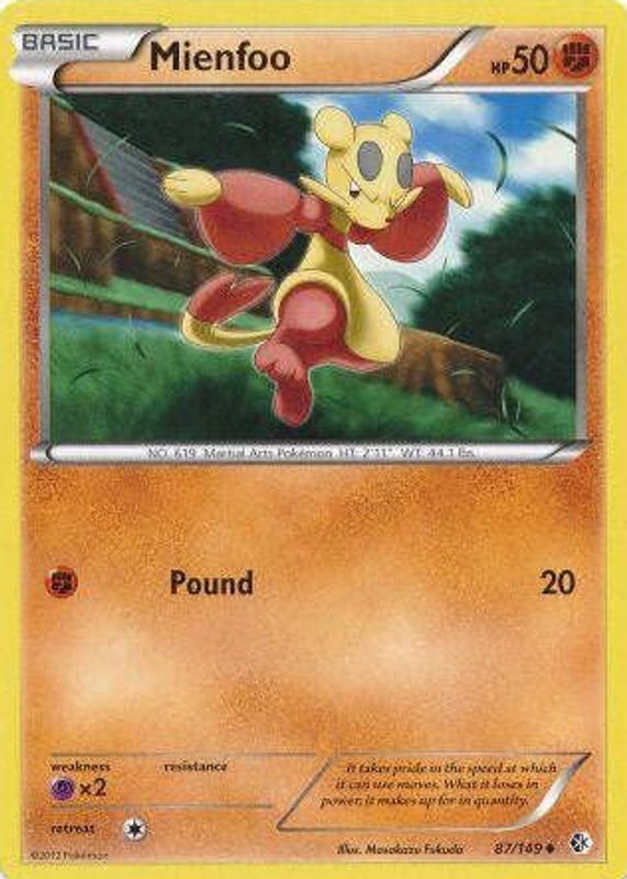 The Mienfoo 2012 Black & White: Boundaries Crossed #087/149 Base card in Raw TCG (Lightly Played) condition has not changed in price in the last 30 days and was last sold for $1.00 .