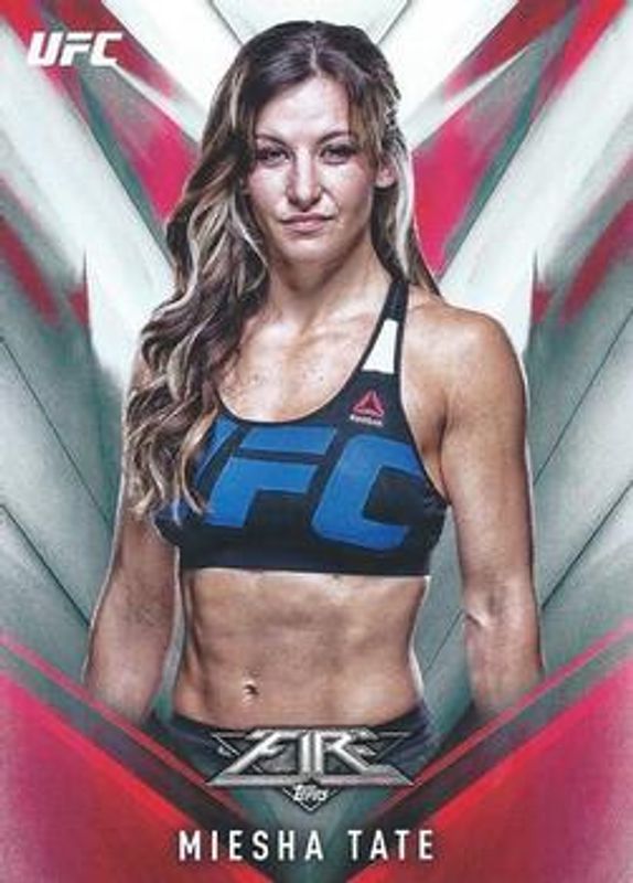 The Miesha Tate 2017 Topps Fire UFC #15 Base card is 1 of 8 Miesha Tate's card variations in the 2017 Topps Fire UFC set being tracked by Sports Card Investor, including Red Hot /142, Blue Flame /25, Inferno /1, Fired Up, and Autographs /149.