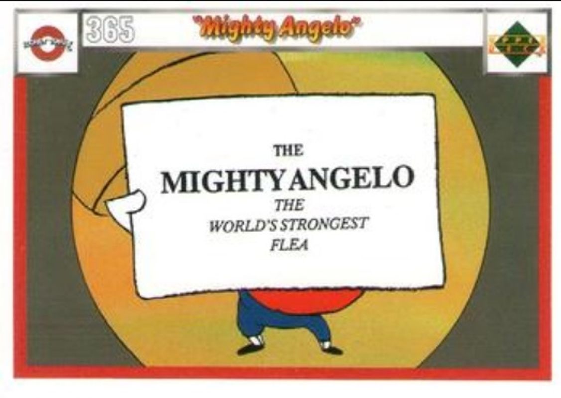 The Mighty Angelo 1990 Upper Deck Comic Ball #365-/-374 Base card is 1 of 18 Mighty Angelo's card variations in the 1990 Upper Deck Comic Ball set being tracked by Sports Card Investor, including #361-/-376 Base, #362-/-377 Base, #363-/-378 Base, #364-/-373 Base, and #366-/-375 Base.