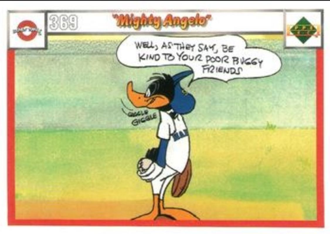 The Mighty Angelo 1990 Upper Deck Comic Ball #369-/-372 Base card is 1 of 18 Mighty Angelo's card variations in the 1990 Upper Deck Comic Ball set being tracked by Sports Card Investor, including #361-/-376 Base, #362-/-377 Base, #363-/-378 Base, #364-/-373 Base, and #365-/-374 Base.