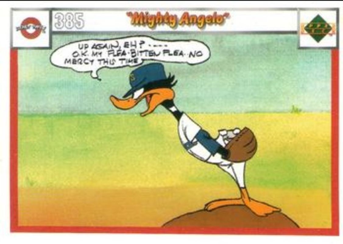 The Mighty Angelo 1990 Upper Deck Comic Ball #385-/-388 Base card is 1 of 18 Mighty Angelo's card variations in the 1990 Upper Deck Comic Ball set being tracked by Sports Card Investor, including #361-/-376 Base, #362-/-377 Base, #363-/-378 Base, #364-/-373 Base, and #365-/-374 Base.