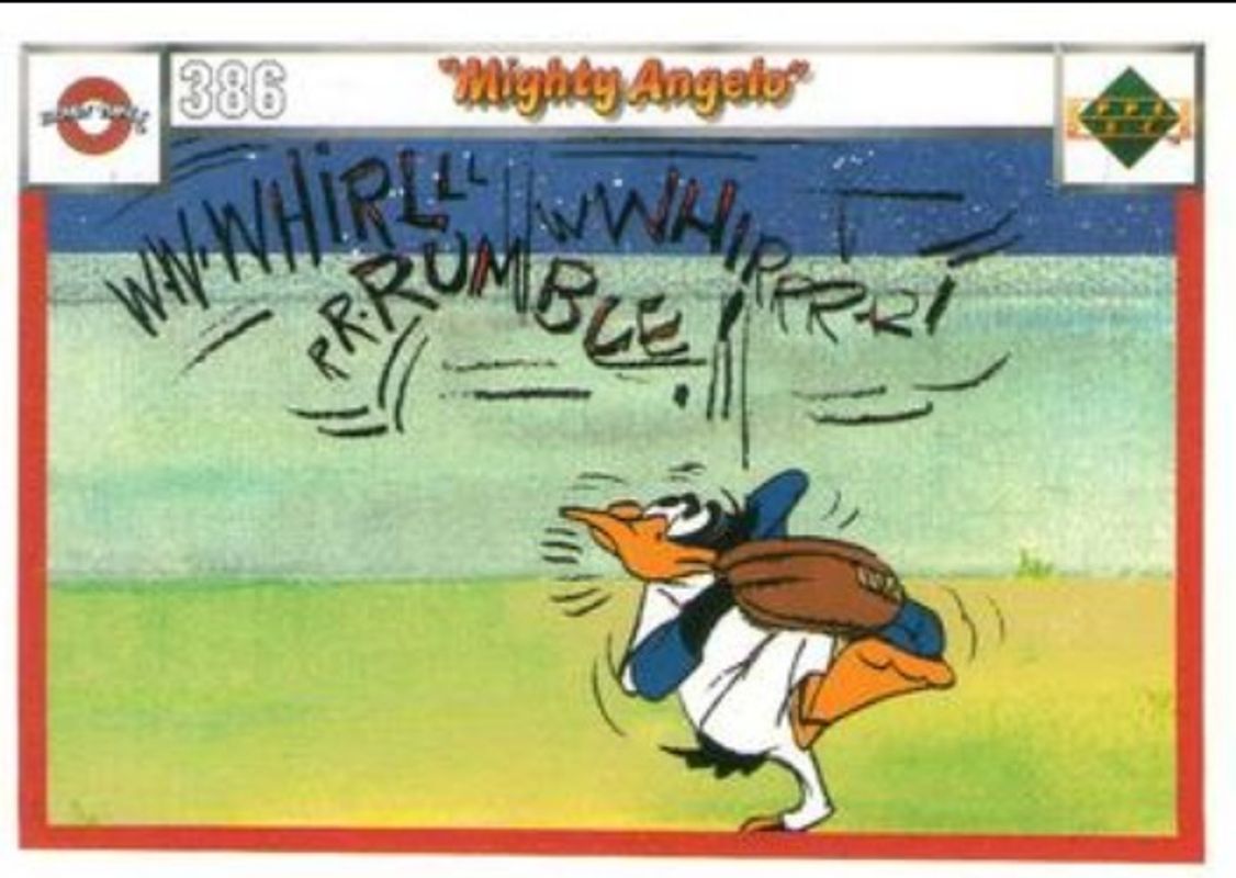 The Mighty Angelo 1990 Upper Deck Comic Ball #386-/-389 Base card is 1 of 18 Mighty Angelo's card variations in the 1990 Upper Deck Comic Ball set being tracked by Sports Card Investor, including #361-/-376 Base, #362-/-377 Base, #363-/-378 Base, #364-/-373 Base, and #365-/-374 Base.