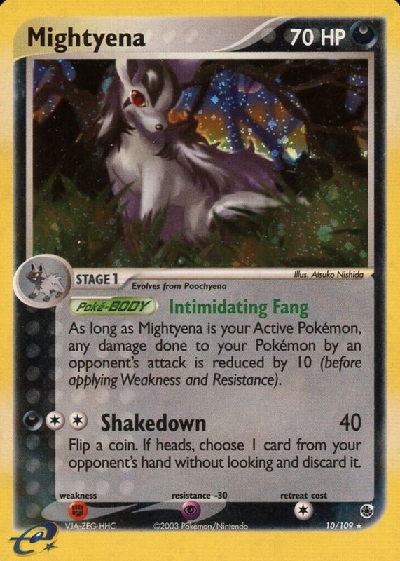 The Mightyena 2003 EX: Ruby & Sapphire #010/109 Holo card in Raw TCG (Near Mint) condition has moved down -$7.00 (-38.9%) in the last 30 days and was last sold for $11.00 .