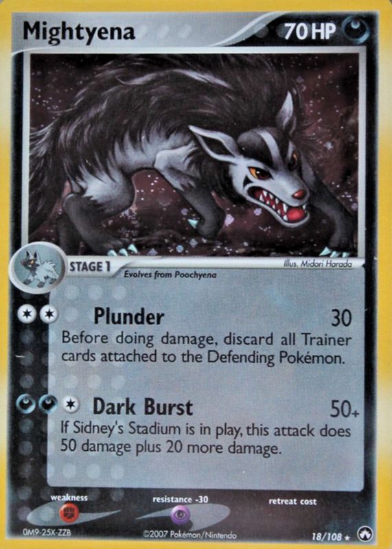 The Mightyena 2007 EX: Power Keepers #018/108 Base card in Raw TCG (Lightly Played) condition has moved up $1.64 (+109%) in the last 30 days and was last sold for $3.14 .