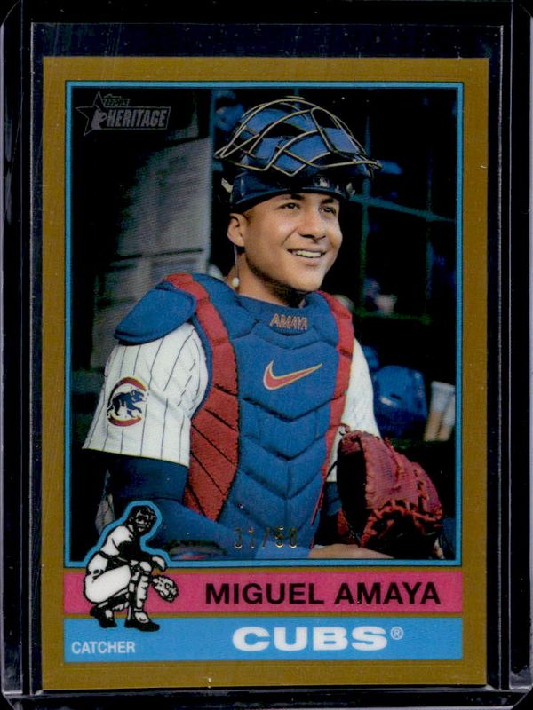 The Miguel Amaya 2025 Topps Heritage #482 Chrome - Gold Refractor /50 card is 1 of 24 Miguel Amaya's card variations in the 2025 Topps Heritage set being tracked by Sports Card Investor, including Base, Black Border, Dark Blue Border, Dark Green Border, and Dark Yellow Border.