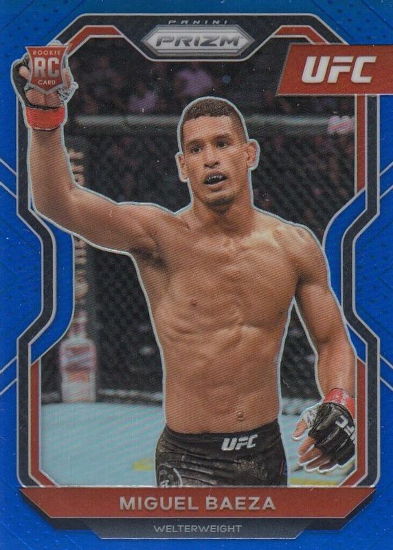The Miguel Baeza 2021 Prizm UFC #92 Blue /199 Rookie card in Raw condition has not changed in price in the last 30 days and was last sold for $1.62 .