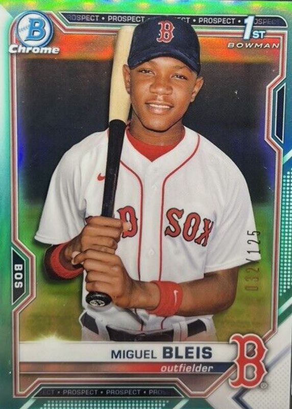 This card is 1 of 24 Miguel Bleis' card variations in the 2021 Bowman Chrome set being tracked by Sports Card Investor, including Prospects (1st), Prospects - Black & White Mini-Diamond Refractor (1st), Prospects - Shimmer Refractor (1st), Prospects - Refractor /499 (1st), and Prospects - Speckle Refractor /299 (1st).