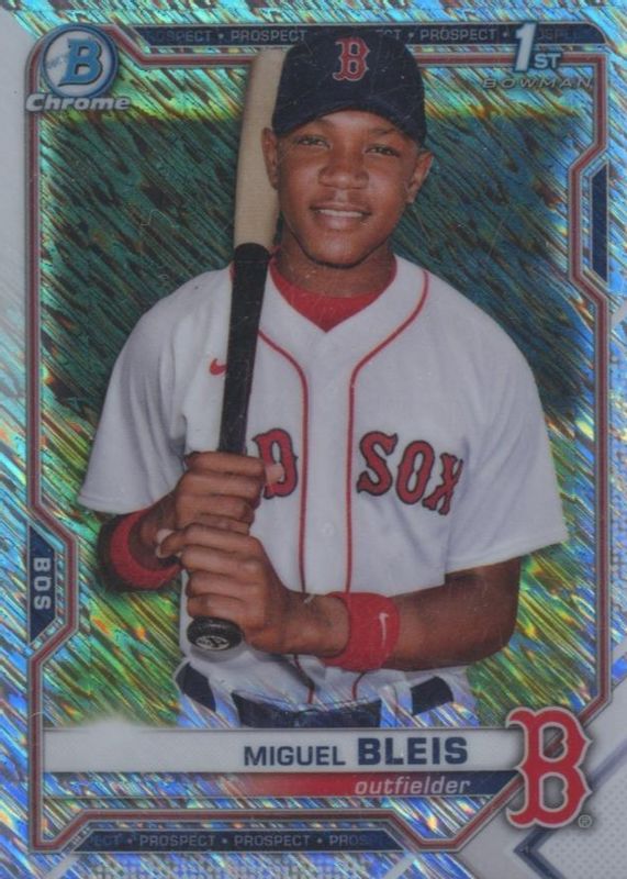 This card is 1 of 24 Miguel Bleis' card variations in the 2021 Bowman Chrome set being tracked by Sports Card Investor, including Prospects (1st), Prospects - Black & White Mini-Diamond Refractor (1st), Prospects - Refractor /499 (1st), Prospects - Speckle Refractor /299 (1st), and Prospects - Purple Refractor /250 (1st).