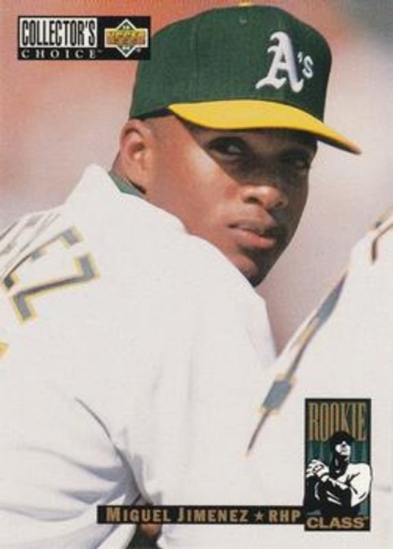 The Miguel Jimenez 1994 Upper Deck Collector's Choice #12 Base Rookie card is 1 of 3 Miguel Jimenez's card variations in the 1994 Upper Deck Collector's Choice set being tracked by Sports Card Investor, including Gold Signatures, and Silver Signatures.