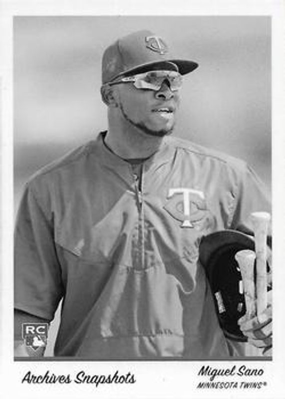 The Miguel Sano 2016 Topps Archives Snapshots #AS-MS Black & White Rookie card is 1 of 5 Miguel Sano's card variations in the 2016 Topps Archives Snapshots set being tracked by Sports Card Investor, including Base, Autographs /350, Autographs - Black & White /10, and Autographs - Negative /5.