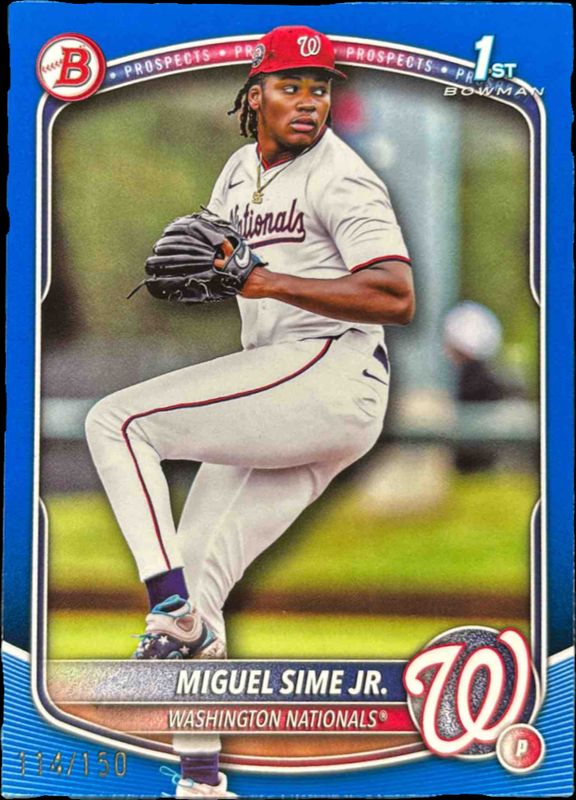 The Miguel Sime Jr. 2025 Bowman Draft #BD-181 Blue Border /150 card is 1 of 86 Miguel Sime Jr.'s card variations in the 2025 Bowman Draft set being tracked by Sports Card Investor, including Base, Chrome, Chrome - Lazer Refractor, Chrome - Refractor, and Chrome - Sky Blue Refractor.