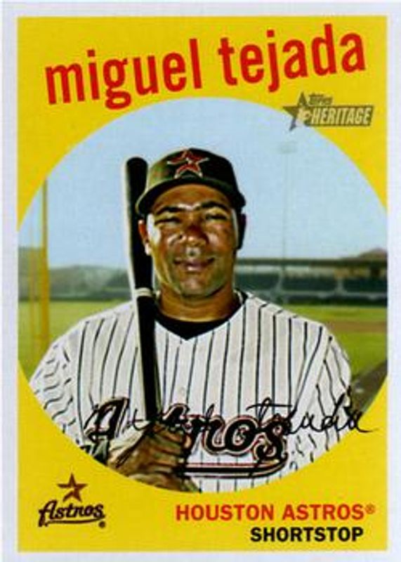 The Miguel Tejada 2008 Topps Heritage #600 Base card is 1 of 6 Miguel Tejada's card variations in the 2008 Topps Heritage set being tracked by Sports Card Investor, including #C215 Chrome /1959, #C215 Chrome Refractor /559, #C215 Chrome Refractor Black /59, #CCMT Clubhouse Collection Relics, and #HCCMT Clubhouse Collection Relics.