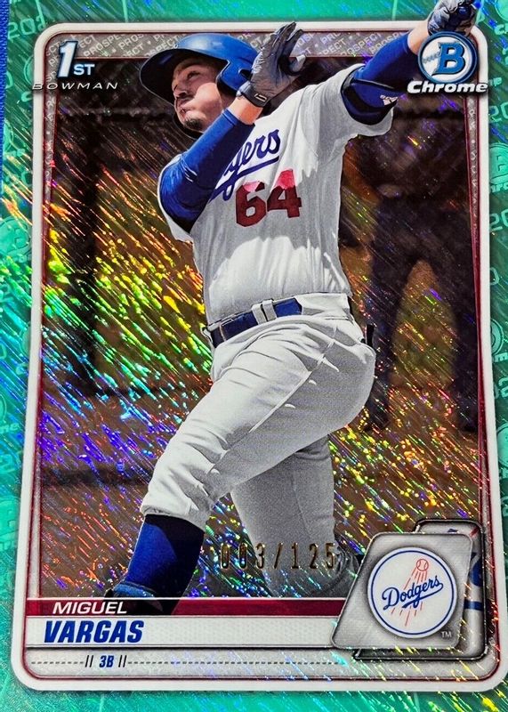 This card is 1 of 35 Miguel Vargas' card variations in the 2020 Bowman set being tracked by Sports Card Investor, including Chrome Prospects (1st), Chrome Prospects - Atomic Refractor (1st), Chrome Prospects - Refractor /499 (1st), Chrome Prospects - Speckle Refractor /299 (1st), and Chrome Prospects - Purple Refractor /250 (1st).
