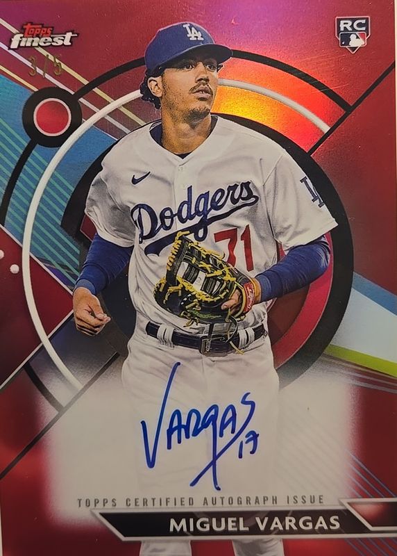 The Miguel Vargas 2023 Topps Finest #FA-MV Finest Autographs - Red Refractor /5 Rookie card in Raw condition has not changed in price in the last 30 days and was last sold for $21.50 .