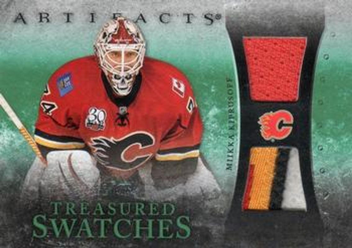 The Miikka Kiprusoff 2010 Upper Deck Artifacts #TS-MK Treasured Swatches Jersey Patch - Emerald /25 card is 1 of 32 Miikka Kiprusoff's card variations in the 2010 Upper Deck Artifacts set being tracked by Sports Card Investor, including Base /699, Emerald /50, Gold /35, Silver /25, and Rainbow /10.