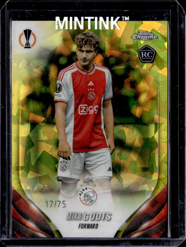 The Mika Godts 2023 Topps Chrome UEFA Club Competitions Sapphire Edition #121 Yellow /75 Rookie card is 1 of 13 Mika Godts' card variations in the 2023 Topps Chrome UEFA Club Competitions Sapphire Edition set being tracked by Sports Card Investor, including Base, Gold /50, Orange /25, Black /10, and Red /5.