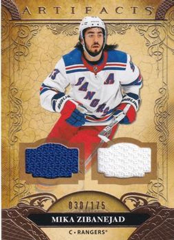 The Mika Zibanejad 2020 Upper Deck Artifacts #29 Material - Gold /145 card is 1 of 16 Mika Zibanejad's card variations in the 2020 Upper Deck Artifacts set being tracked by Sports Card Investor, including Base /999, Blue Sapphire /499, Copper /299, Emerald /99, and Autumn /75.