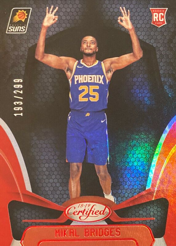 The Mikal Bridges 2018 Certified #160 Mirror Red /299 Rookie card in Raw condition has not changed in price in the last 30 days and was last sold for $2.55 .