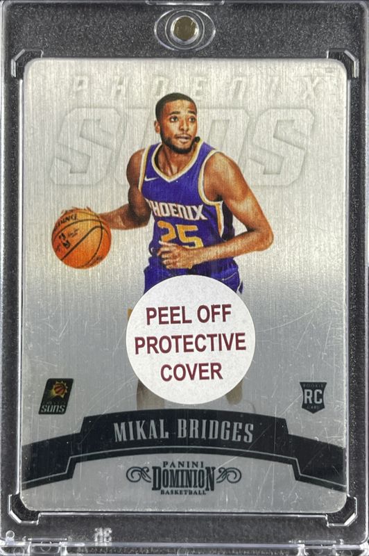 The Mikal Bridges 2018 Dominion #120 Base /75 Rookie card is 1 of 24 Mikal Bridges' card variations in the 2018 Dominion set being tracked by Sports Card Investor, including #176 Base /75, #120 Red /49, #176 Red /49, #176 Gold /25, and #120 Gold /25.
