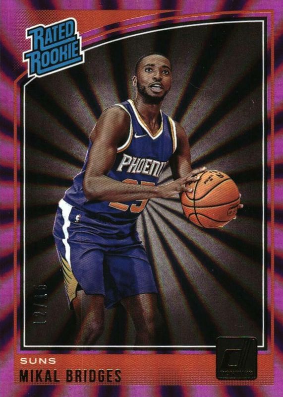 The Mikal Bridges 2018 Donruss #200 Purple Laser /15 Rookie card in Raw condition has not changed in price in the last 30 days and was last sold for $50.00 .
