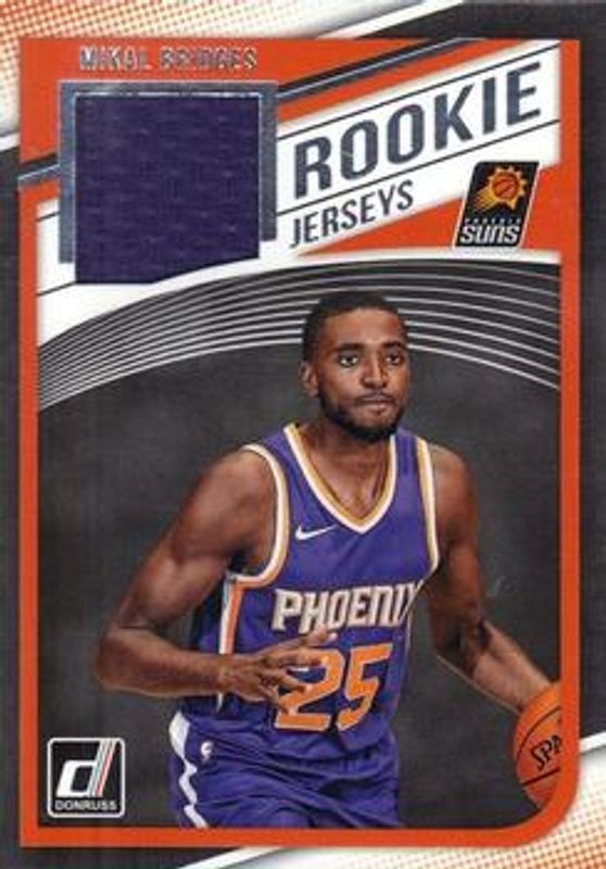 The Mikal Bridges 2018 Donruss #RJ-MKB Rookie Jerseys card is 1 of 42 Mikal Bridges' card variations in the 2018 Donruss set being tracked by Sports Card Investor, including Base, Green Flood, Green & Yellow Laser, Orange Laser, and Yellow Flood.
