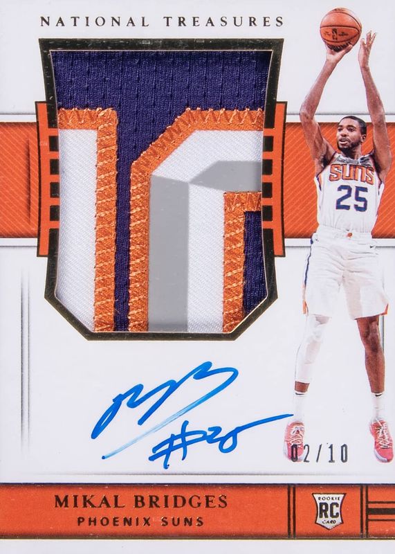 This card is 1 of 8 Mikal Bridges' card variations in the 2018 National Treasures set being tracked by Sports Card Investor, including Rookie Patch Auto /99, Rookie Patch Auto - FOTL /20, Rookie Patch Auto - Emerald /5, Rookie Patch Auto - Blue FOTL /3, and Rookie Patch Auto - Logoman /1.