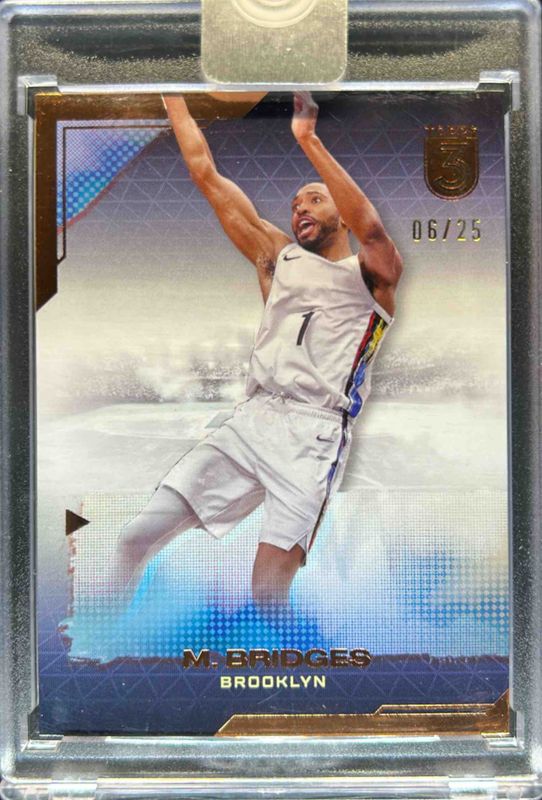 The Mikal Bridges 2023 Topps Three #88 Bronze /25 card is 1 of 21 Mikal Bridges' card variations in the 2023 Topps Three set being tracked by Sports Card Investor, including Base /49, Gold /10, Red /5, Platinum /1, and Relics Autographs Prime /49.