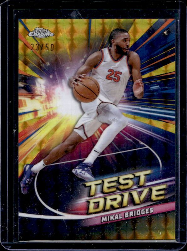 The Mikal Bridges 2024 Topps Chrome #TD-3 Test Drive - Gold Geometric Refractor /50 card is 1 of 59 Mikal Bridges' card variations in the 2024 Topps Chrome set being tracked by Sports Card Investor, including Base, Blue Basketball Refractor, Magenta Refractor, Negative Refractor, and Pink Basketball Refractor.