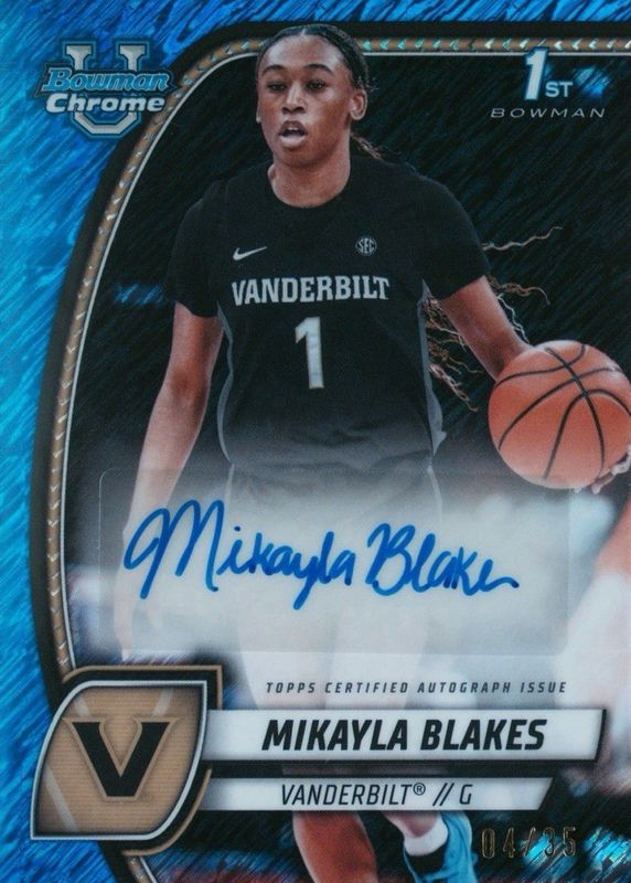 This card is 1 of 19 Mikayla Blakes' card variations in the 2024 Bowman Chrome University set being tracked by Sports Card Investor, including Prospect Auto (1st), Prospect Auto - Black Wave Refractor (1st), Prospect Auto - Green Shimmer Refractor (1st), Prospect Auto - Refractor (1st), and Prospect Auto - Stealth Refractor (1st).