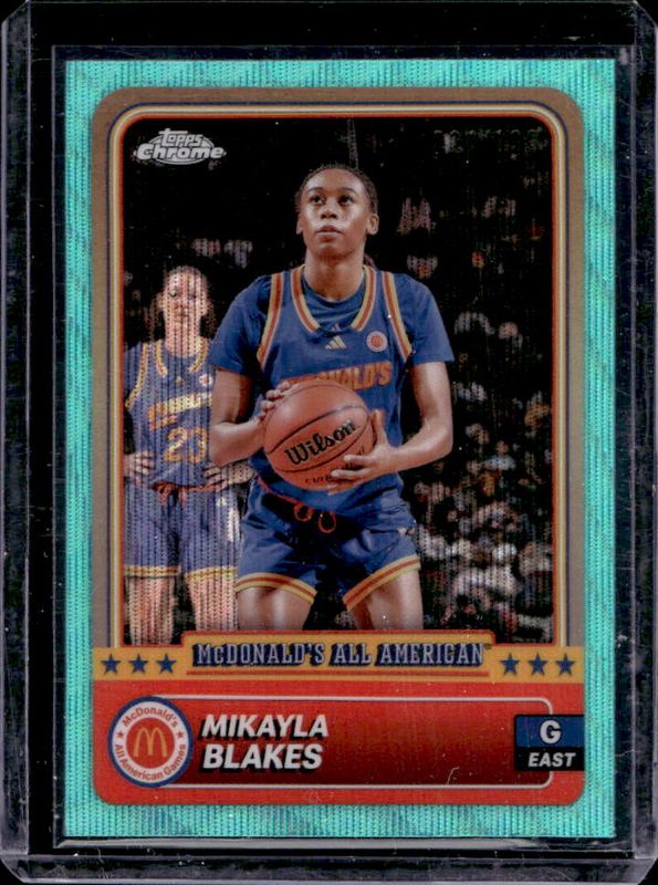 The Mikayla Blakes 2024 Topps Chrome McDonald's All-American #1 Aqua Wave Refractor /199 card is 1 of 102 Mikayla Blakes' card variations in the 2024 Topps Chrome McDonald's All-American set being tracked by Sports Card Investor, including #1 Base, #51 Base, #1 Blue RayWave Refractor, #51 Blue RayWave Refractor, and #1 McDonald's Logo Refractor.