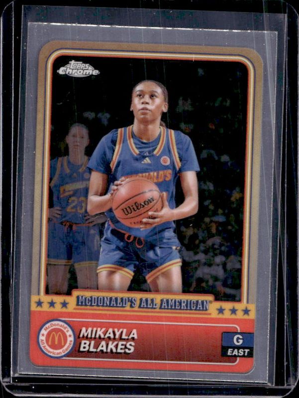 The Mikayla Blakes 2024 Topps Chrome McDonald's All-American #1 Base card is 1 of 102 Mikayla Blakes' card variations in the 2024 Topps Chrome McDonald's All-American set being tracked by Sports Card Investor, including #51 Base, #1 Blue RayWave Refractor, #51 Blue RayWave Refractor, #1 McDonald's Logo Refractor, and #51 McDonald's Logo Refractor.