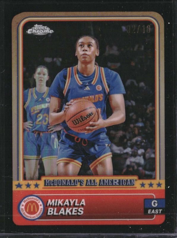 The Mikayla Blakes 2024 Topps Chrome McDonald's All-American #1 Black Refractor /10 card is 1 of 102 Mikayla Blakes' card variations in the 2024 Topps Chrome McDonald's All-American set being tracked by Sports Card Investor, including #1 Base, #51 Base, #1 Blue RayWave Refractor, #51 Blue RayWave Refractor, and #1 McDonald's Logo Refractor.