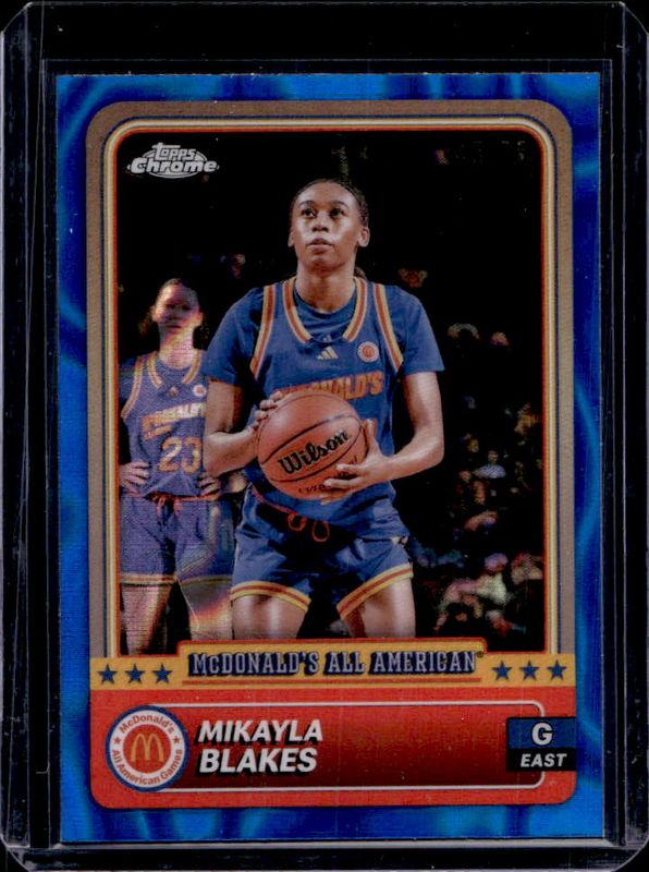 The Mikayla Blakes 2024 Topps Chrome McDonald's All-American #1 Blue Lava Refractor /75 card is 1 of 102 Mikayla Blakes' card variations in the 2024 Topps Chrome McDonald's All-American set being tracked by Sports Card Investor, including #1 Base, #51 Base, #1 Blue RayWave Refractor, #51 Blue RayWave Refractor, and #1 McDonald's Logo Refractor.