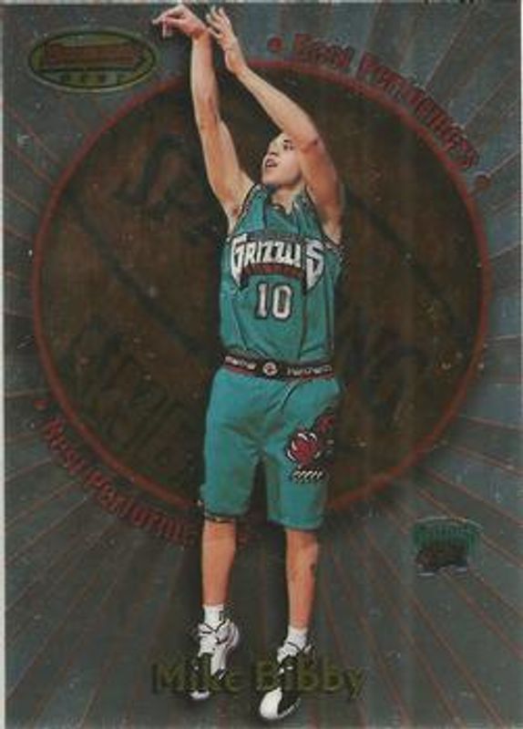 The Mike Bibby 1998 Bowman's Best #BP8 Performers Rookie card is 1 of 9 Mike Bibby's card variations in the 1998 Bowman's Best set being tracked by Sports Card Investor, including Base, Refractor /400, Atomic Refractor /100, Autographs, and Autographs - Atomic Refractor.