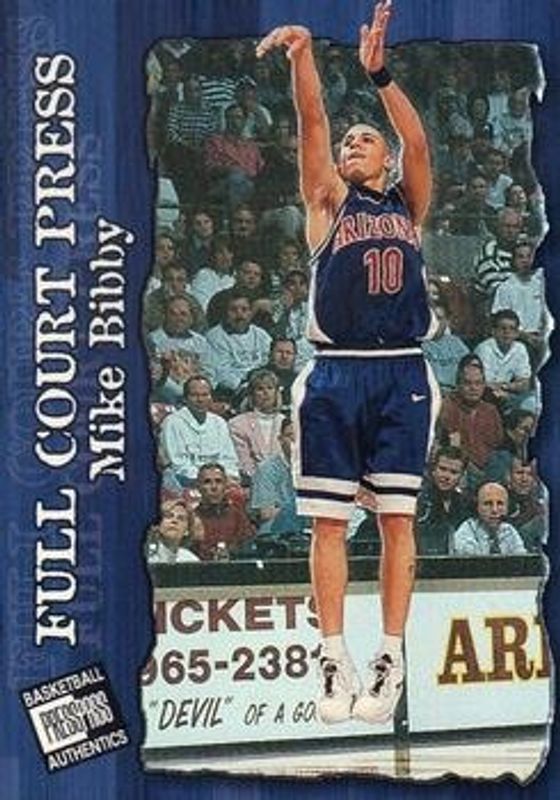 The Mike Bibby 1998 Press Pass Authentics #FP11 Full Court Press Rookie card is 1 of 9 Mike Bibby's card variations in the 1998 Press Pass Authentics set being tracked by Sports Card Investor, including Base, Hang Time, Autographs, Lottery Club, and Signed Memorabilia.