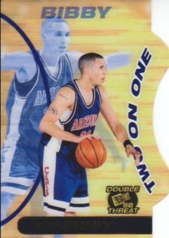 The Mike Bibby 1998 Press Pass Double Threat #TO7 Two On One Rookie card is 1 of 9 Mike Bibby's card variations in the 1998 Press Pass Double Threat set being tracked by Sports Card Investor, including Base, Alley Oop, Torquers, Jackpot, and Retros.