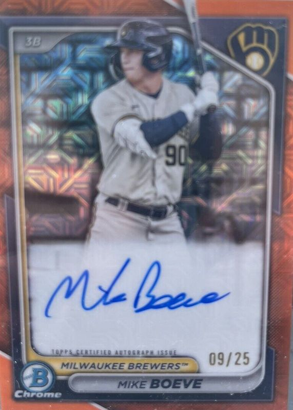 Auctions Ending Soon for Mike Boeve 2024 Bowman Mega Box #BMA-MB Chrome Prospect Auto - Orange Refractor /25 RAW