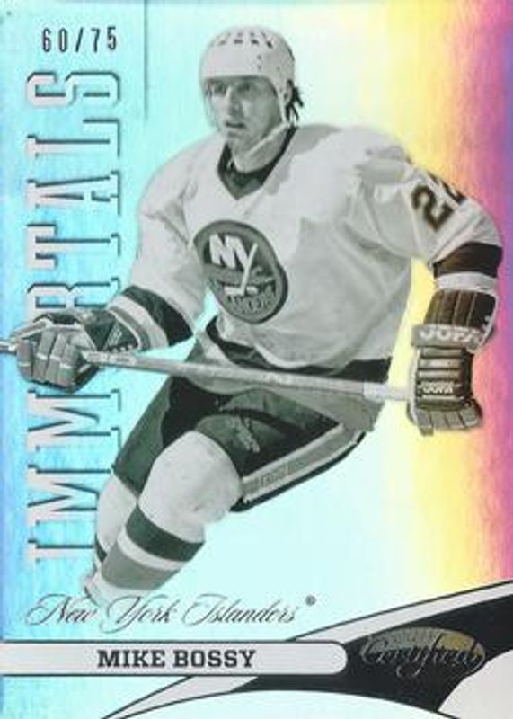 The Mike Bossy 2012 Certified #129 Mirror Hot Box /75 card is 1 of 7 Mike Bossy's card variations in the 2012 Certified set being tracked by Sports Card Investor, including Base /999, Mirror Red /100, Mirror Blue /50, Mirror Gold /25, and Mirror Emerald /5.