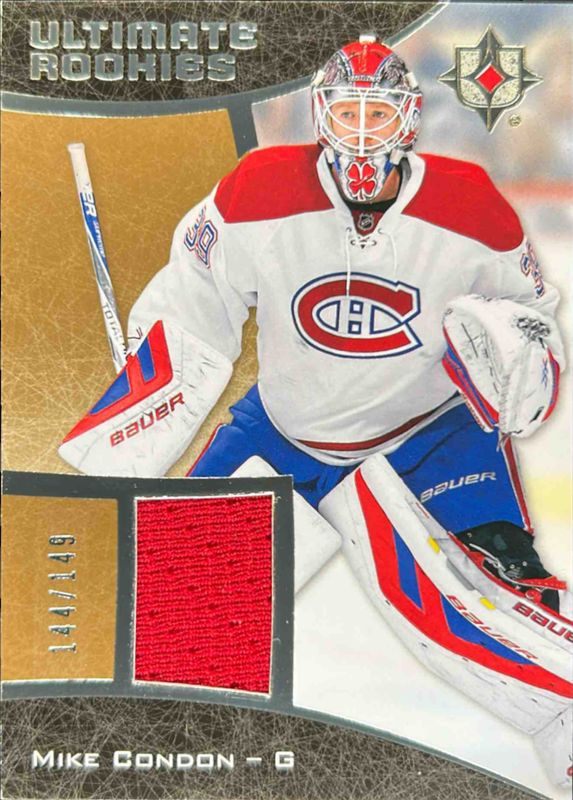 The Mike Condon 2015 Upper Deck Ultimate Collection #84 Ultimate Rookies /149 card is 1 of 17 Mike Condon's card variations in the 2015 Upper Deck Ultimate Collection set being tracked by Sports Card Investor, including Base /149, Jersey Relics Gold Patch /25, Jersey Relics Spectrum Silver Auto Jersey /25, Jersey Relics Spectrum Gold Auto Patch /15, and Jersey Relics Platinum Blue Relic /5.