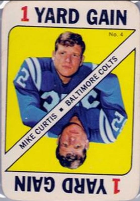 The Mike Curtis 1971 Topps #4 Game Inserts card is 1 of 2 Mike Curtis' card variations in the 1971 Topps set being tracked by Sports Card Investor, including Base.