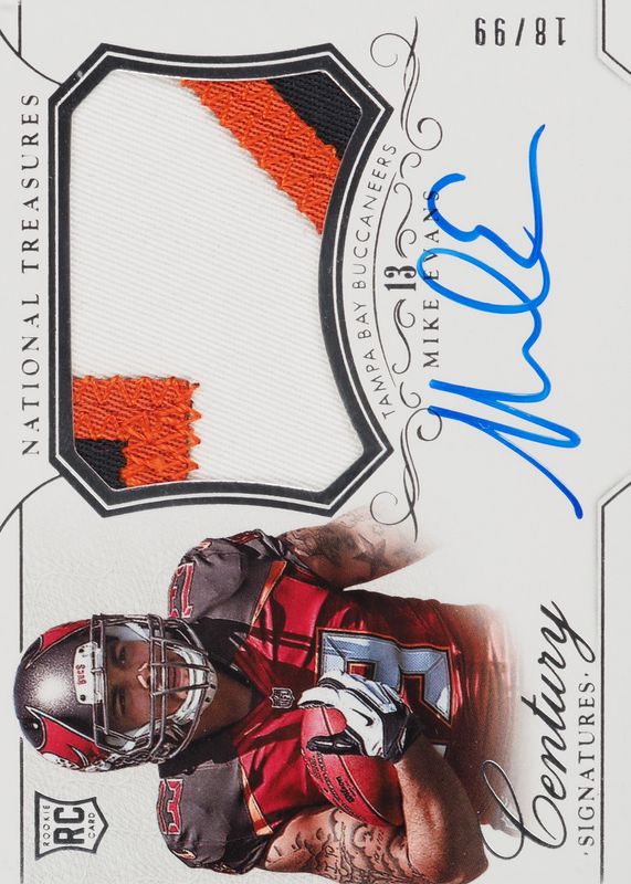 This card is 1 of 9 Mike Evans' card variations in the 2014 National Treasures set being tracked by Sports Card Investor, including Rookie Patch Auto - Numbers (/13), Rookie Patch Auto - Silver /25, Rookie Patch Auto - Gold /10, Rookie Patch Auto - Black /5, and Rookie Patch Auto - Blue /1.